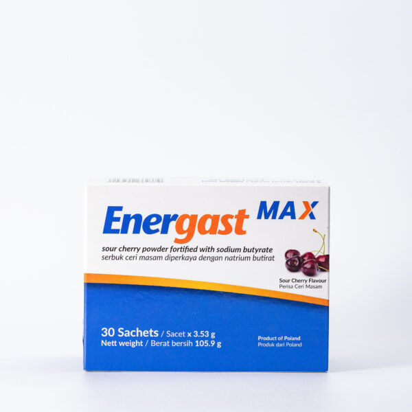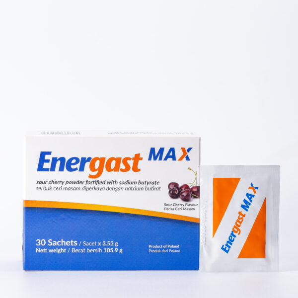 Energast™ Max ialah formulasi unik yang mengandungi natrium butirat yang dimikroenkapsulasi dalam matriks trigliserida. Ia digunakan sebagai terapi sokongan (adjuvan) untuk membantu pengurusan simptom gangguan usus seperti sembelit, cirit-birit, sakit perut, kembung, kekejangan abdomen dan perut berangin. Ia juga membantu mengekalkan kesihatan usus secara menyeluruh.