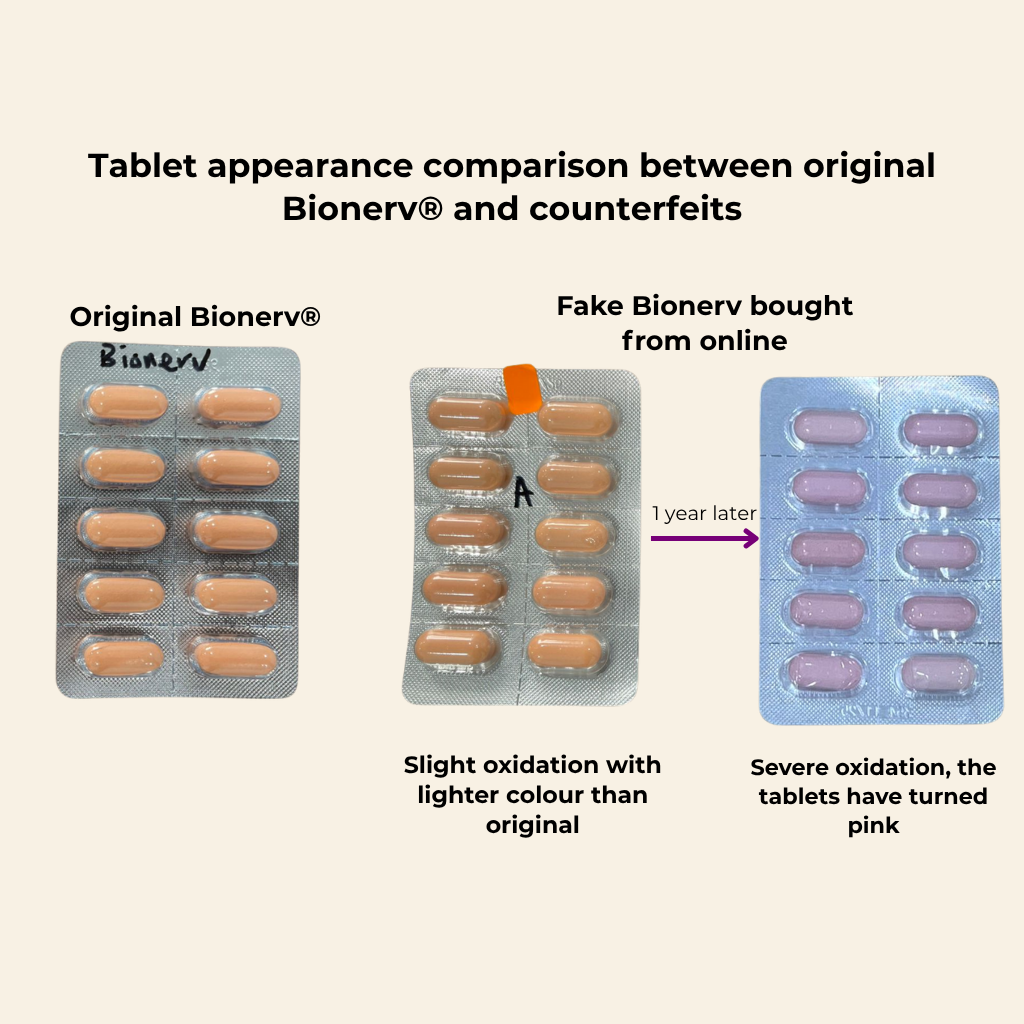 These counterfeit tablets may mimic Bionerv in appearance, but not in safety, quality or effectiveness. Upon testing, lab results show these counterfeit tablets do not contain any of Bionerv®’s active ingredients meant to support the original function of Bionerv®. After just one year, the counterfeit tablets oxidized and turned pink, which indicates a clear sign of chemical instability.